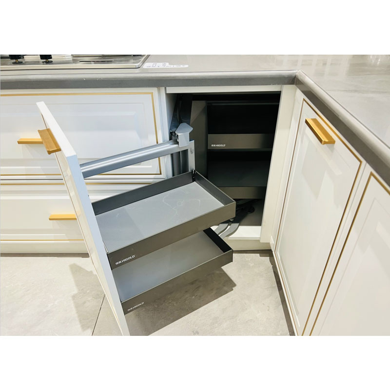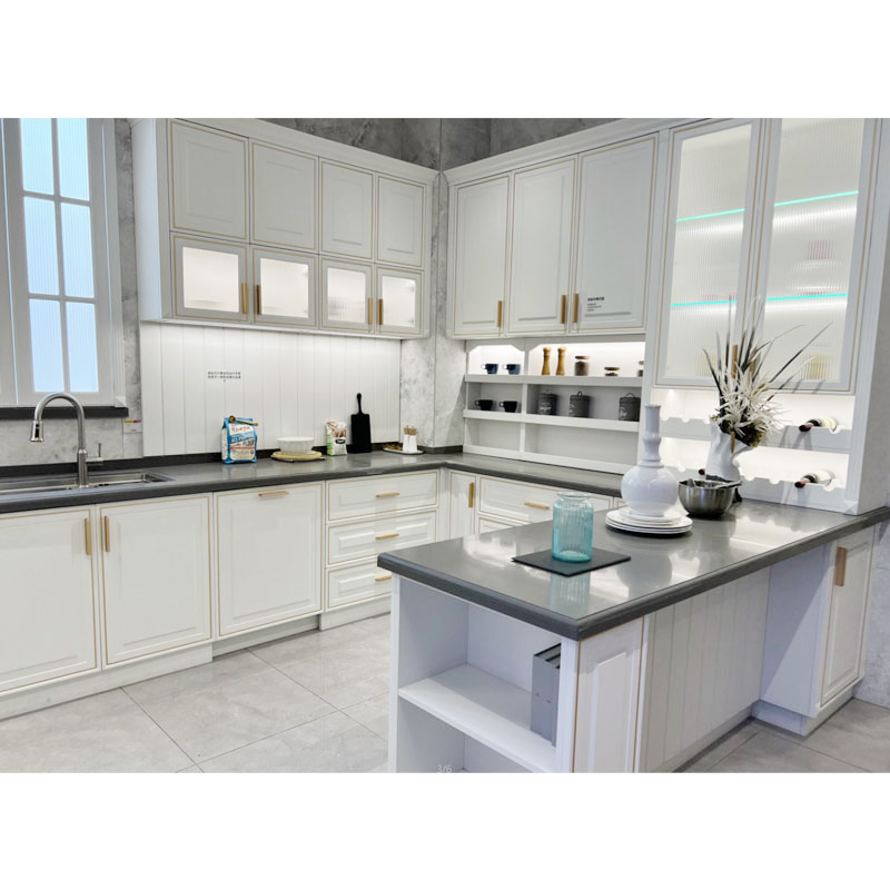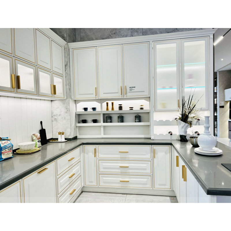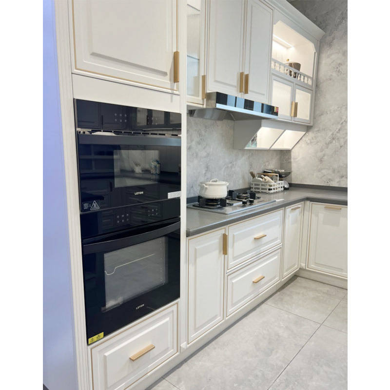 Ang mga puting cabinet sa kusina ay napakadaling pagsamahin sa iyong istilo ng dekorasyon sa bahay. Sinoah puting PVC kitchen cabinet na may parisukat na hugis ng mga pinto ng kitchen cabinet. Ang mga puting cabinet sa kusina ay tumutugma sa ginintuang kulay ng mga hawakan ng mga cabinet sa kusina upang gawing moderno at klasikal na tradisyonal na kusina ang mga minimalist na cabinet sa kusina.