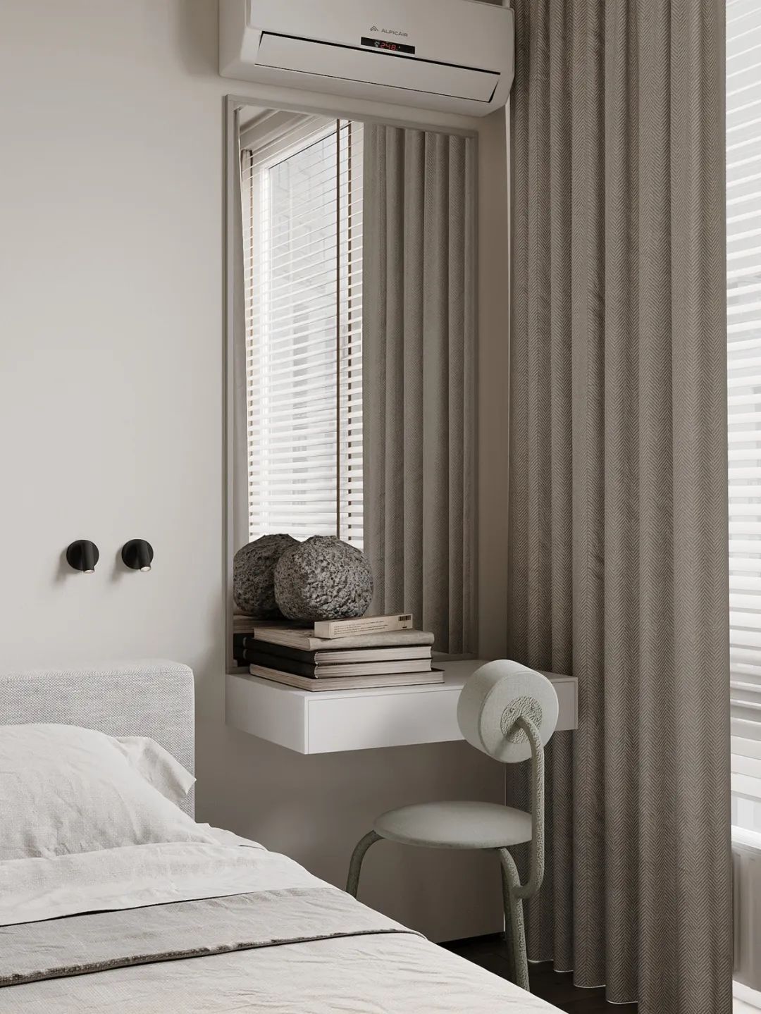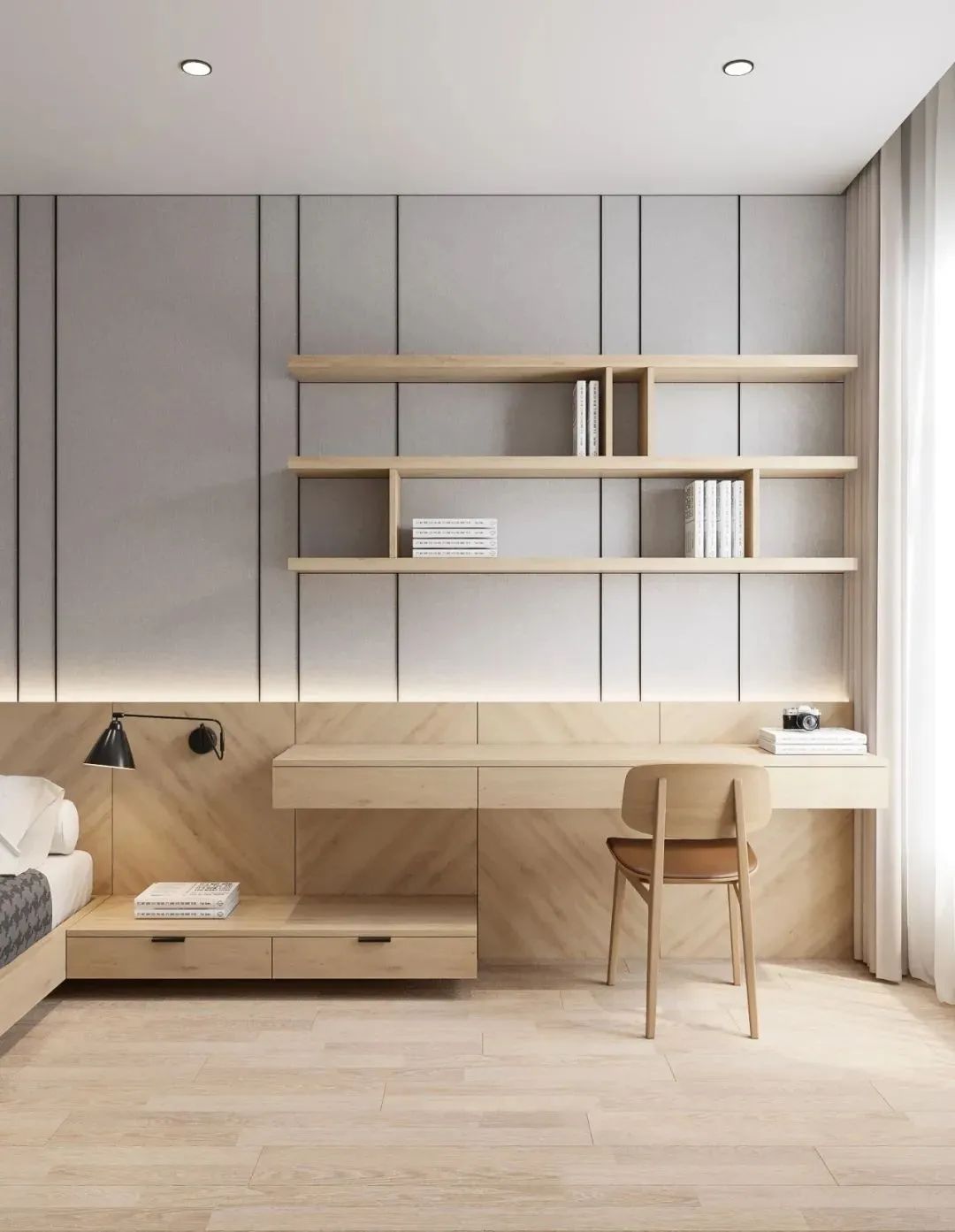 Ang mga tradisyunal na talahanayan ng kama ay sumasakop sa isang malaking halaga ng espasyo at kawalan ng pag -personalize at kahulugan ng fashion. Ang pagsuspinde sa talahanayan ng kama sa dingding at pagpapasadya nito nang integral sa pader ng background ay lumilikha ng isang 整齐划一 at sopistikadong hitsura.