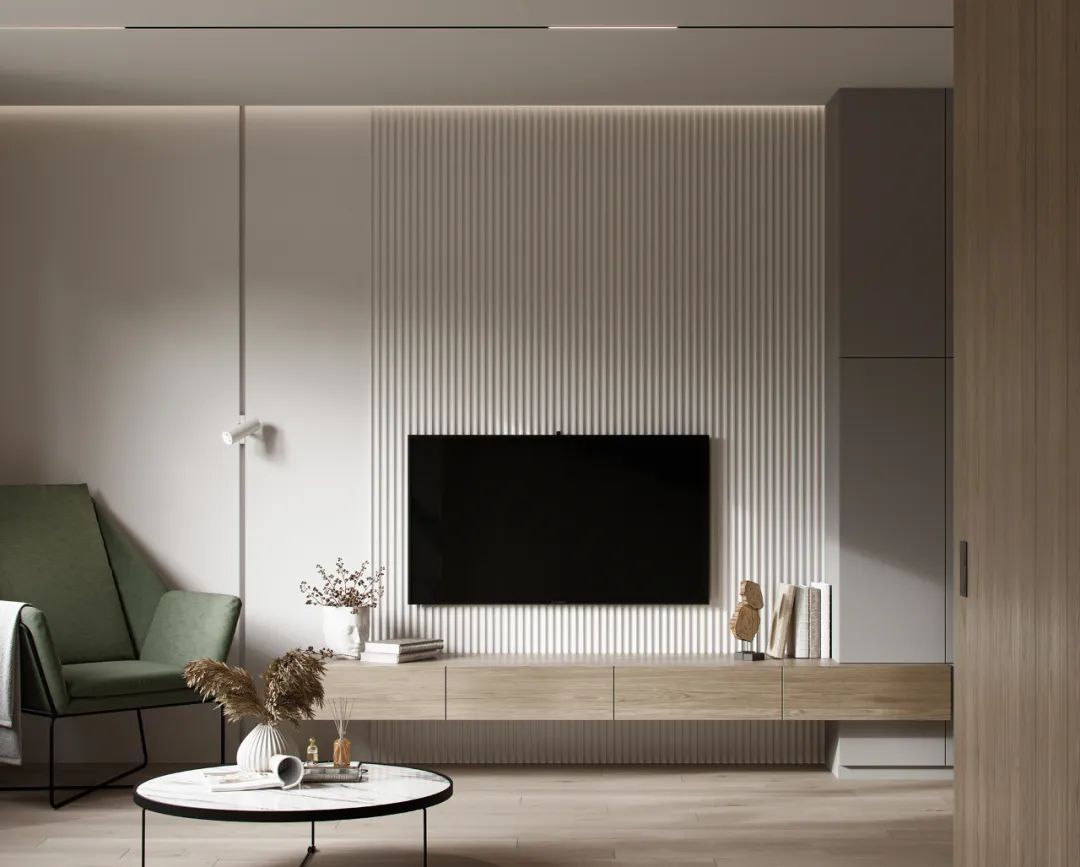 Ang nasuspinde na disenyo ay hindi limitado sa mga cabinets. Ang isang nasuspinde na pader ng TV na nagsisilbing isang spatial divider ay isang tanyag na pagpipilian sa mga araw na ito, pagdaragdag ng isang ugnay ng kagandahan sa bahay.
