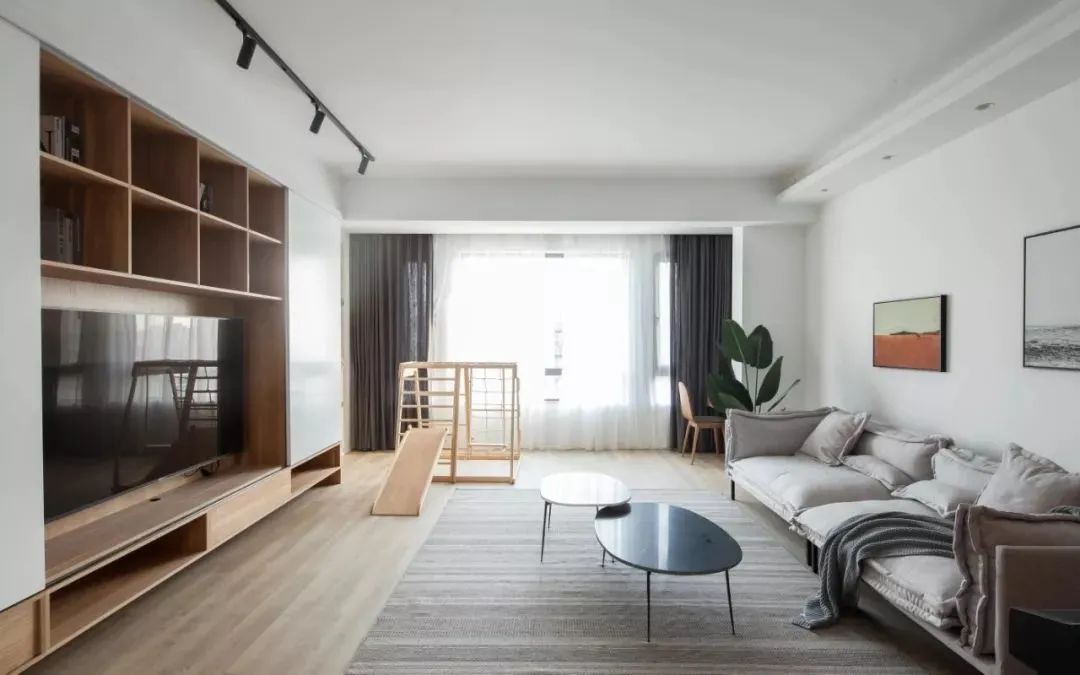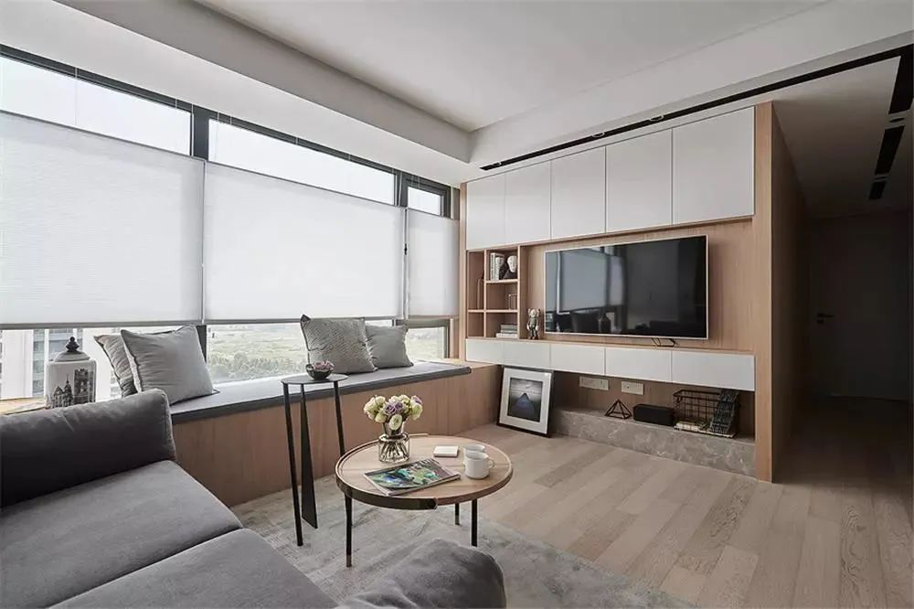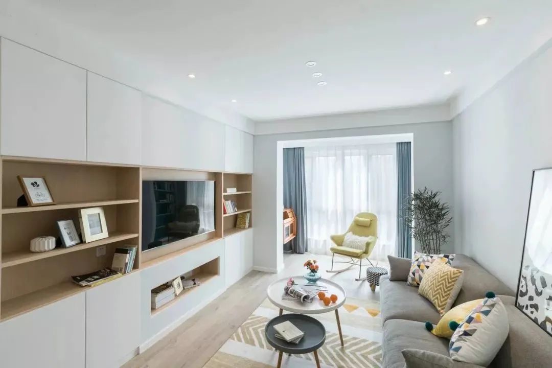 Bookcase ng TV Wall:I-customize ang isang buong pader ng mga cabinets ng imbakan sa sala, pinagsasama ang TV cabinet gamit ang aparador para sa isang dalawang-sa-isang disenyo.