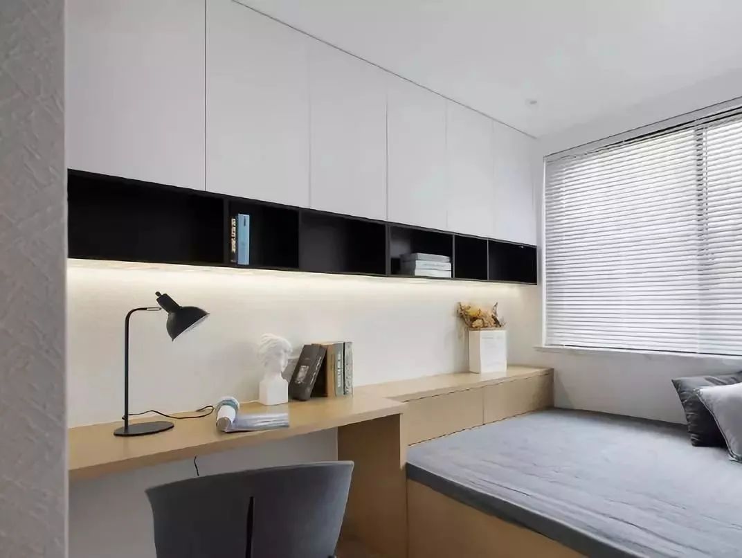 Bedside desk at gabinete:Para sa mga sitwasyon kung saan inilalagay ang isang desk sa tabi ng kama, gumamit lamang ng isang pinagsamang disenyo ng desk at gabinete.